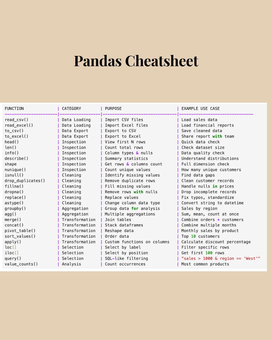 Grab your Pandas CheatSheet here. Everything you need to know about Pandas - from file operations to visualisations in one place.